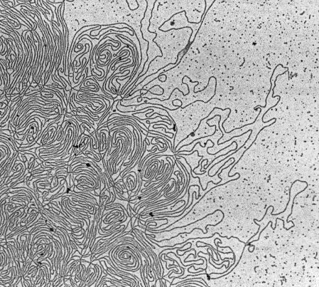 This image shows a bit (no more than 3%) of the single molecule of DNA released from a single human chromosome. (The chromosome was treated to remove its histones). Remembering that this is 3% of the DNA of only one of the 46 chromosomes in the human diploid cell, you can appreciate the problem faced by the cell of how to separate without error these great lengths of DNA without creating horrible tangles.Mitosis