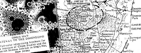 EC: Pal, I've got lots of answers! Alternative answers. Get it? But that's not important. You ask why "my theory" isn't better known or more "popular" ? Why aren't they discussing it at UFO conferences, eh? Why isn't it on TV? Well, there's an easy answer to that. The truth is never popular, and it's never seen on TV ! You know in your heart I'm right about this don't you? If you think about what's really important to you, you'll realize it's not popular and it's never been seen on TV (or if it has...well then I'm sorry for you). It's true, when I first came across the information...I was living in Chatsworth, in the Pine Barrens, near Ong's Hat...I was doing a catalogue...Tesla, Reich, Bioshamanics, Hollow Earth, crop circles, Mae Brussell...that sort of thing. Strange stories were circulating about the Institute out at Ong's Hat. They wouldn't talk to me. Then they disappeared. That's when I got "really" interested, and began collecting the literature. A few years later I published the catalogue to see if they'd get in touch with me. I wanted to flush them out. I wanted to know.
