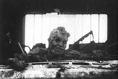 Incinerated body of an Iraqi soldier on the "Highway of Death," a name the press has given to the road from Mutlaa, Kuwait, to Basra, Iraq. U.S. planes immobilized the convoy by disabling vehicles at its front and rear, then bombing and straffing the resulting traffic jam for hours. More than 2,000 vehicles and tens of thousands of charred and dismembered bodies littered the sixty miles of highway. The clear rapid incineration of the human being [pictured above] suggests the use of napalm, phosphorus, or other incindiary bombs. These are anti-personnel weapons outlawed under the 1977 Geneva Protocols. This massive attack occurred after Saddam Hussein announced a complete troop withdrawl from Kuwait in compliance with UN Resolution 660. Such a massacre of withdrawing Iraqi soldiers violates the Geneva Convention of 1949, common article 3, which outlaws the killing of soldiers who "are out of combat." There are, in addition, strong indications that many of those killed were Palestinian and Kuwaiti civilians trying to escape the impending seige of Kuwait City and the return of Kuwaiti armed forces. No attempt was made by U.S. military command to distinguish between military personnel and civilians on the "highway of death." The whole intent of international law with regard to war is to prevent just this sort of indescriminate and excessive use of force.